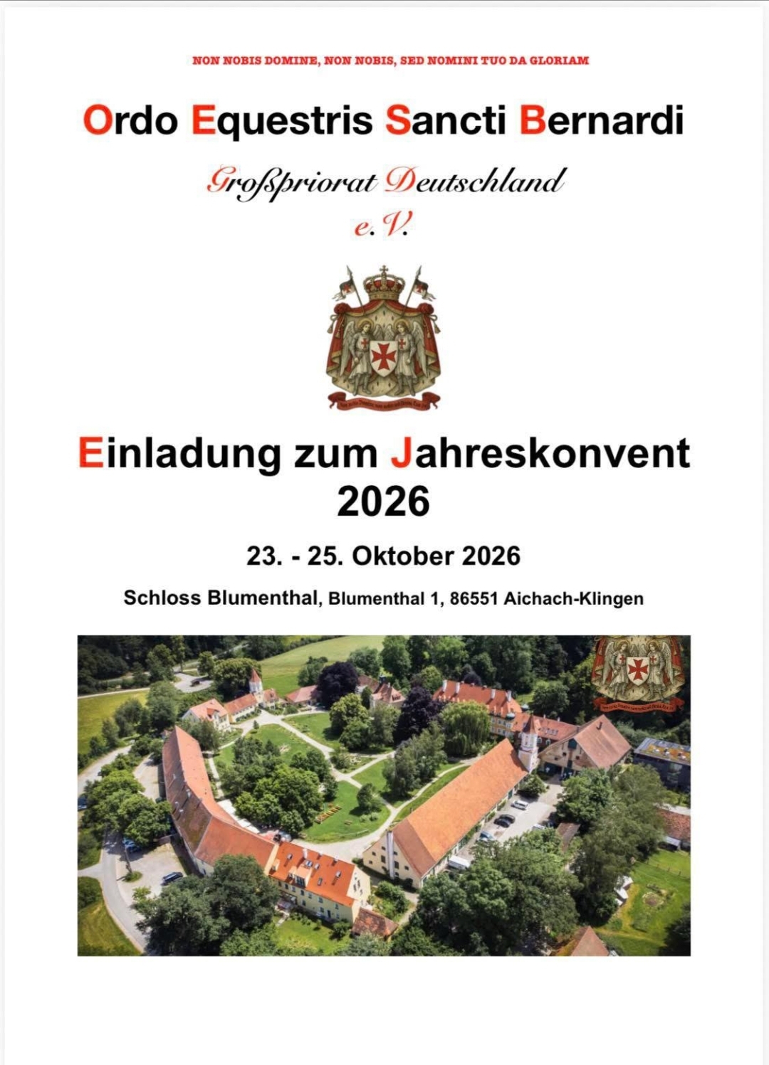 | Oktober | 24. bis 26. | JAHRESKONVENT 2025 - Ordo Equestris Sancti Bernardi, Schloss Blumenthal, Aichach (D) Einladung, hier Anmeldung, hier |